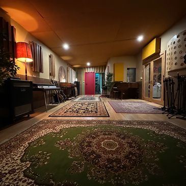Our live room has a large open recording space and an isolation booth with glass doors to the side.